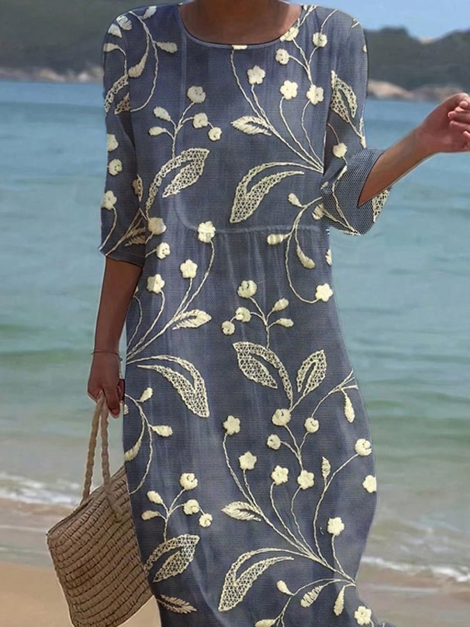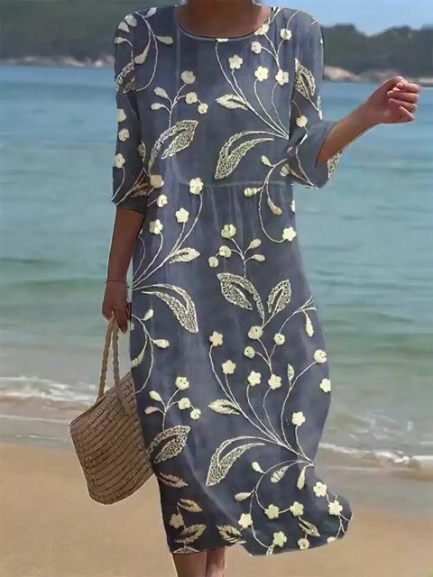 Női egyszínű, kerek nyakú, félig virágmintás pamut és lenvászon ruha