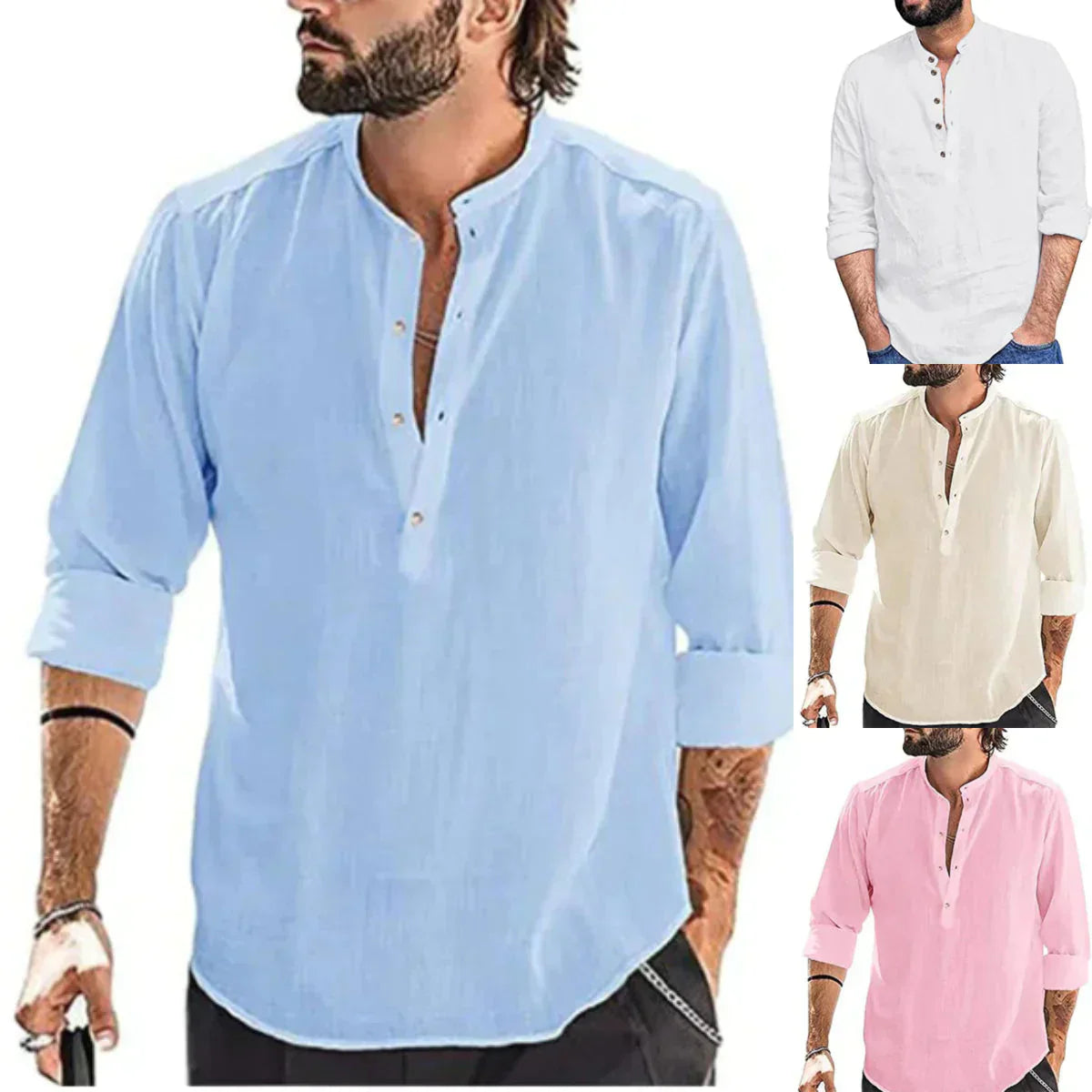 【Jellemzők】 Alkalmi férfi vászoning állógallérral, egyszínű, vékony szabású, hosszú ujjú (felhajtott) és gombos záródású.
