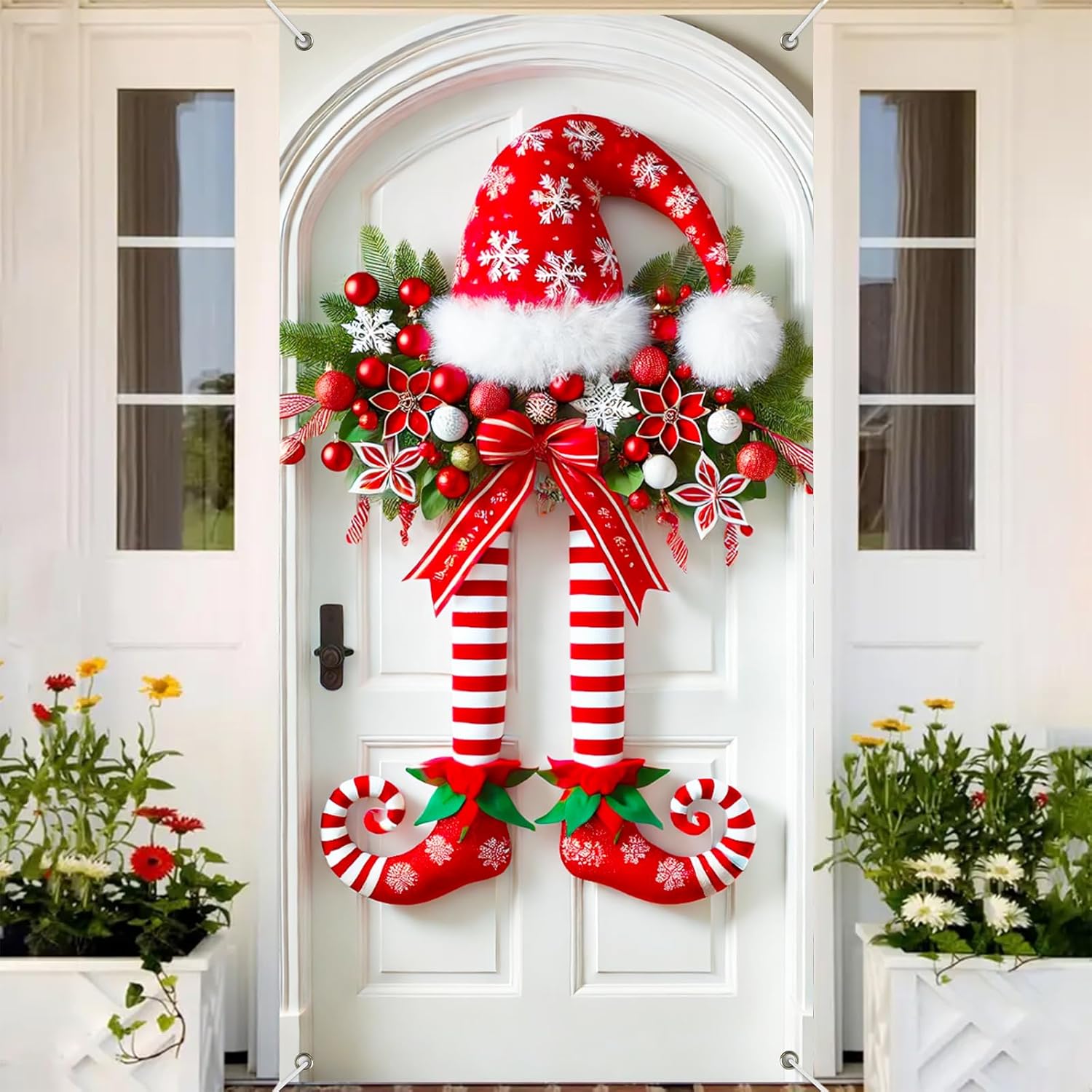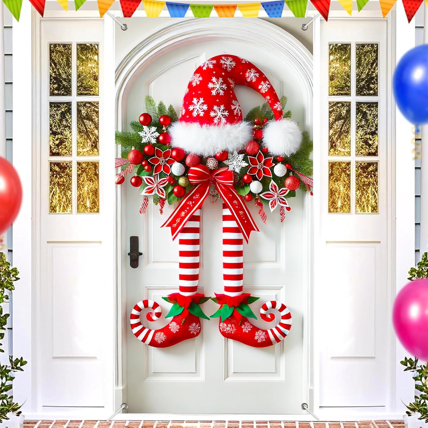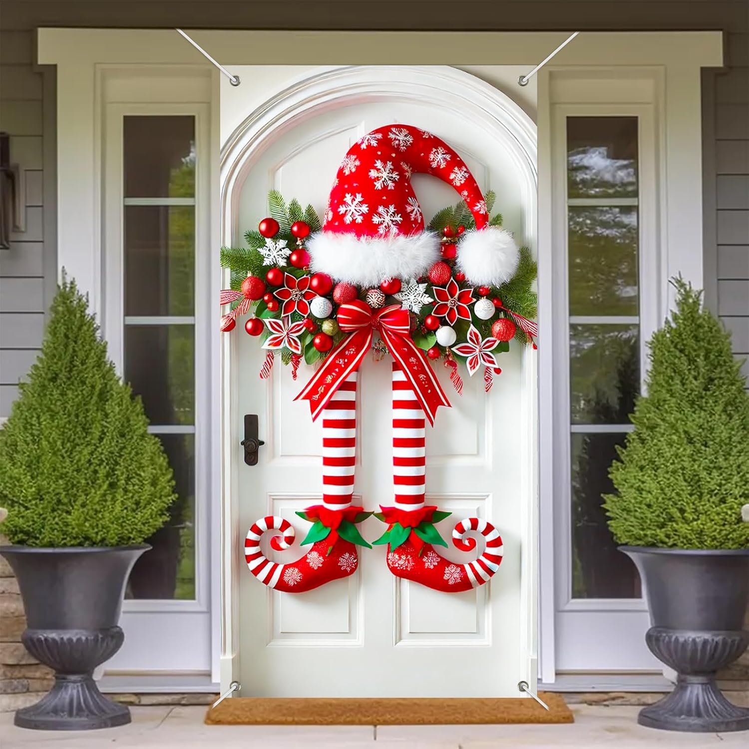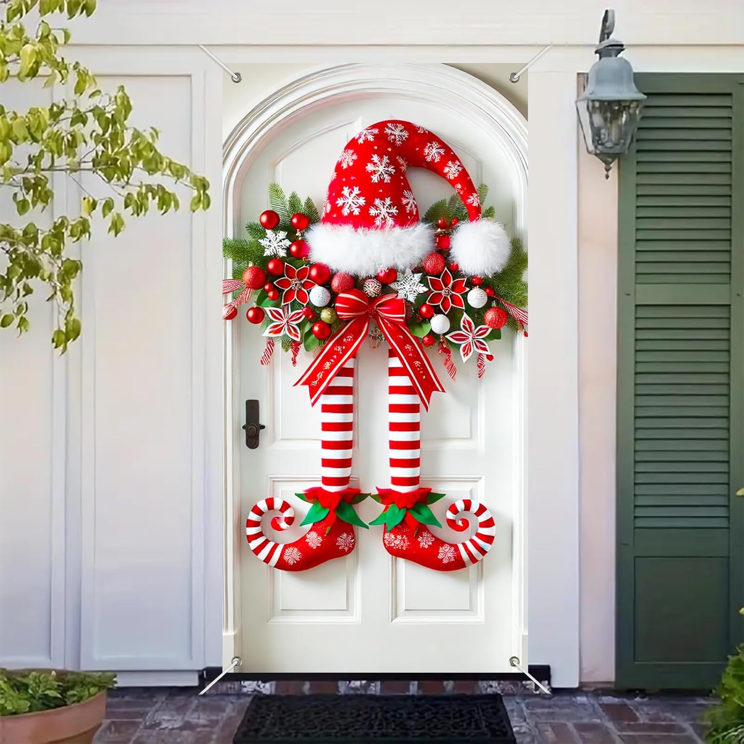 Vidám manóláb-dizájn: Csíkos manólábakkal, göndör csizmákkal, hópehely sapkával és ünnepi dekorációkkal ez a transzparens élénk karácsonyi hangulatot teremt a verandán vagy a partin.