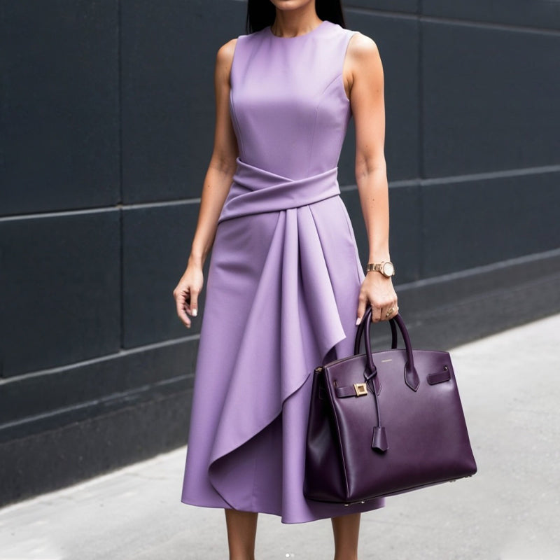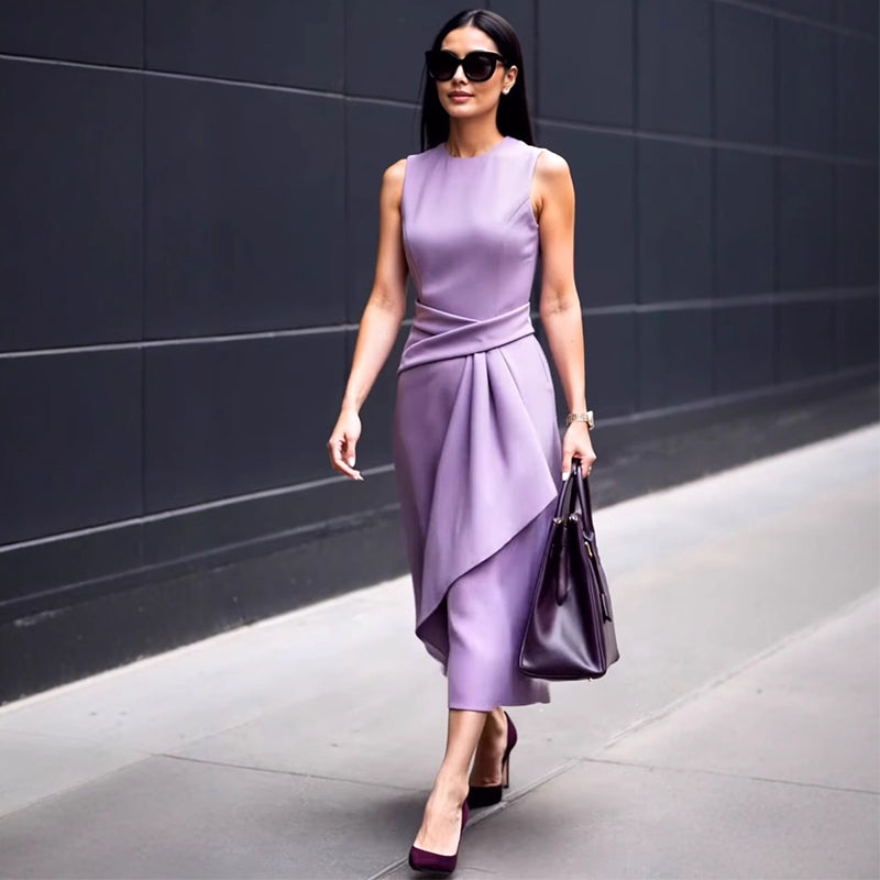Stratégiai rakástechnikákkal készített ujjatlan szabásminta természetesen simul a testhez, elegáns sziluettet ápolva. Az aszimmetrikus rakás vizuálisan meghosszabbítja a ruhát, finoman kiemelve a derekat és a csípő íveit, formált vonalakat hozva létre, így tökéletes nappali tevékenységekhez és esti összejövetelekhez egyaránt.