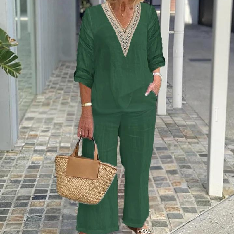 A szett tartalma: 1 db női V-nyakú felső és bő szárú nadrág
