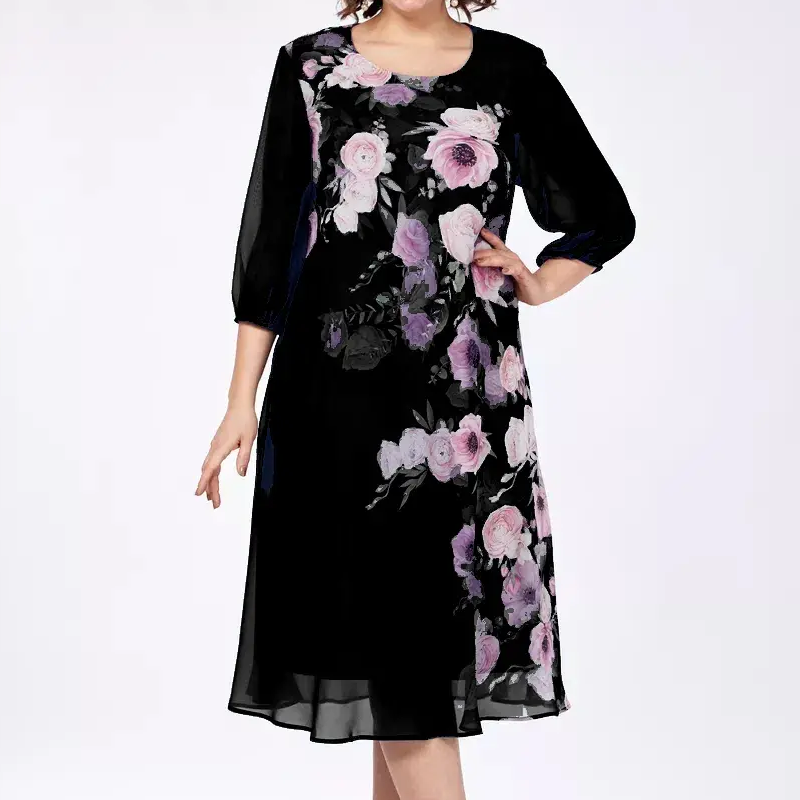 Elegáns virágmintás sifon ruha kerek nyakkivágással